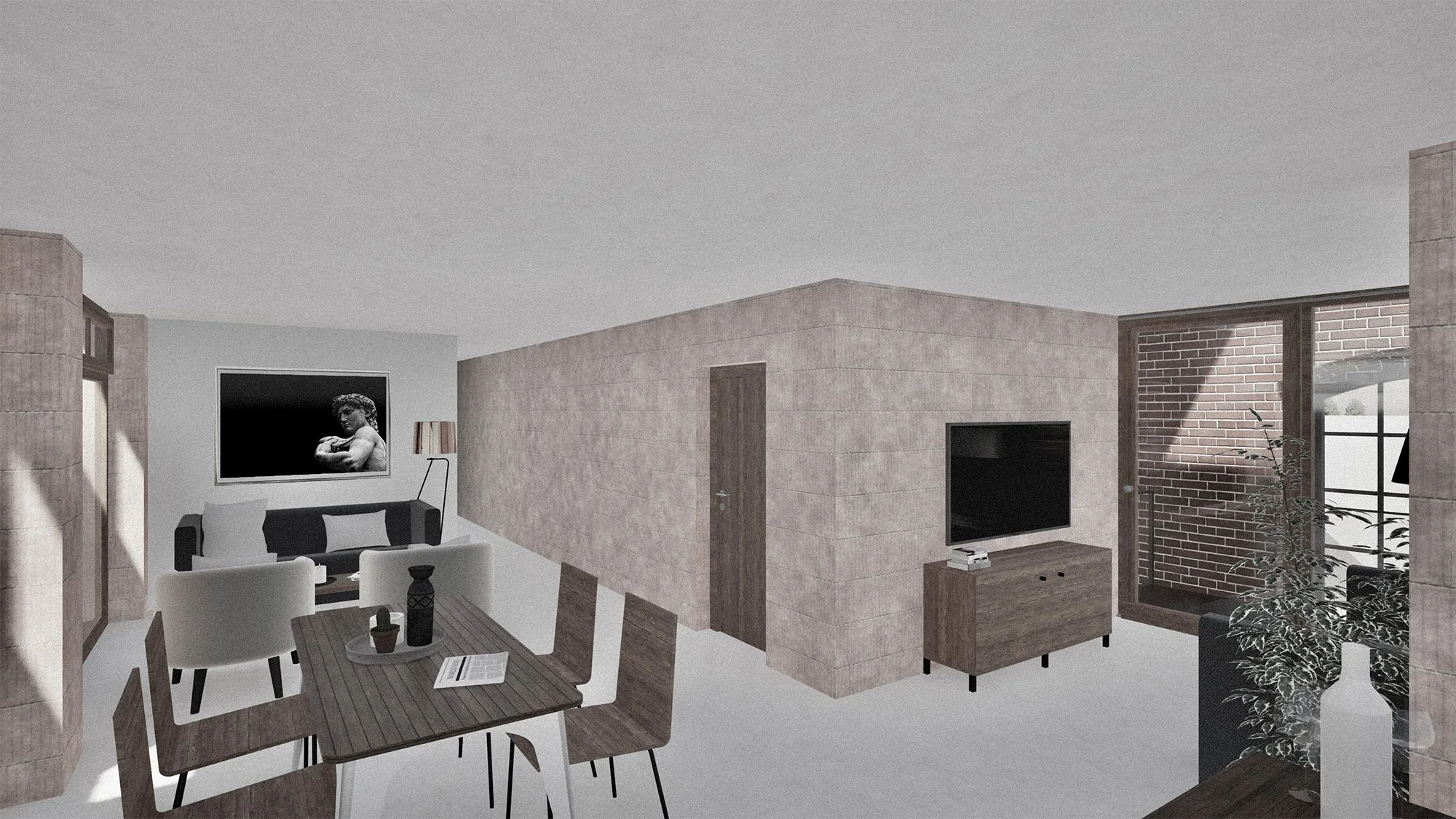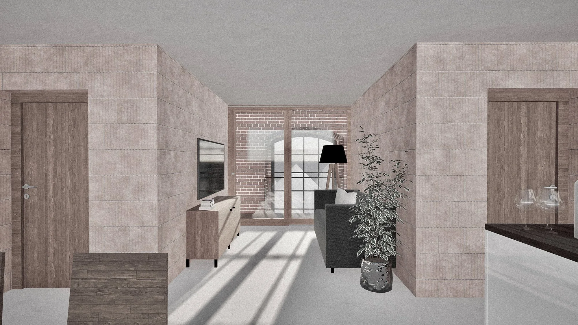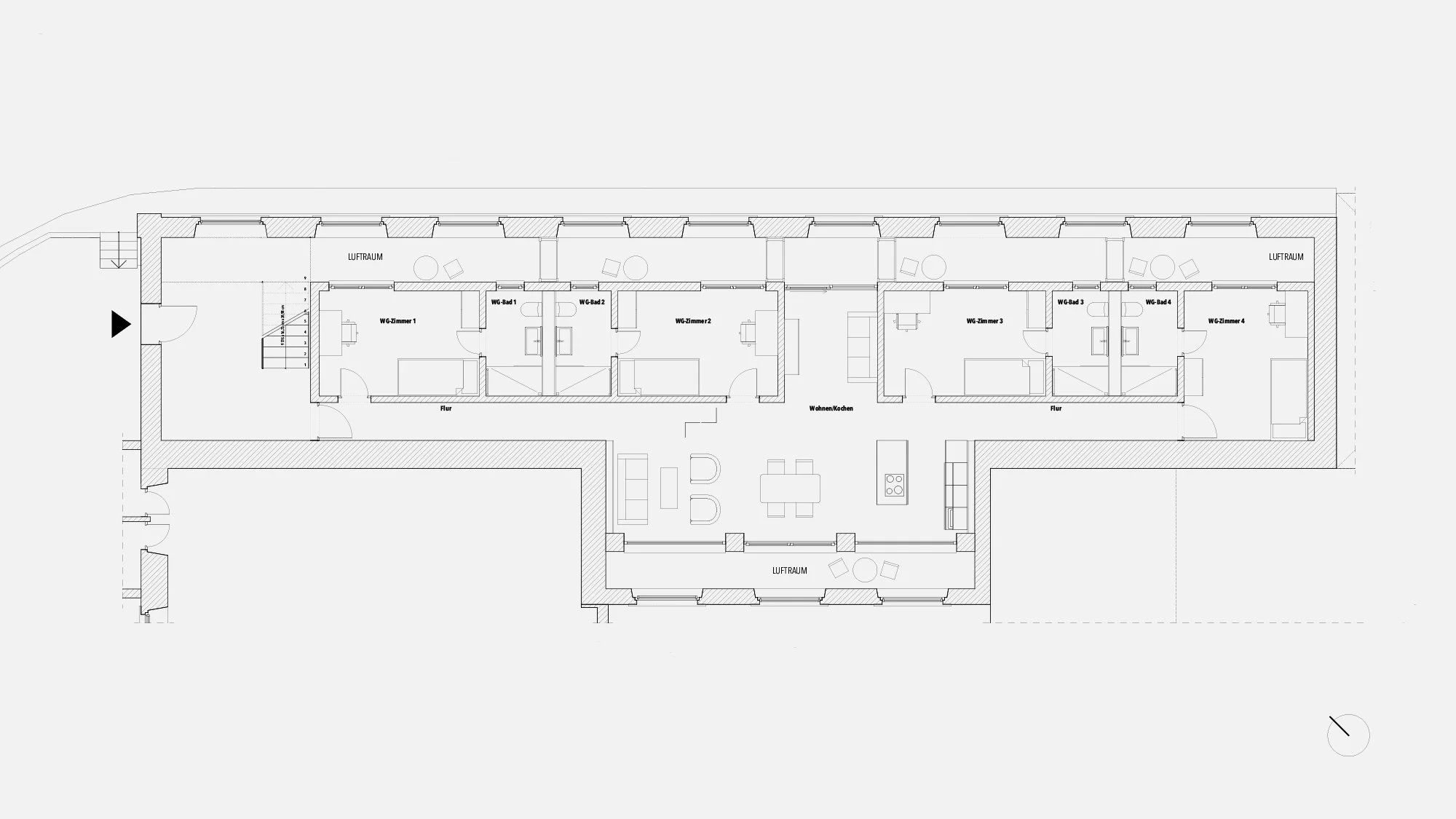 „Less is more“- unverputzte Hochlochziegelwände, geschliffener Estrich und eine Stahltreppe prägen unseren innenliegenden, dreigeschossigen Neubau, formen unsere Ästhetik und fördern eine umweltfreundliche Bauweise.