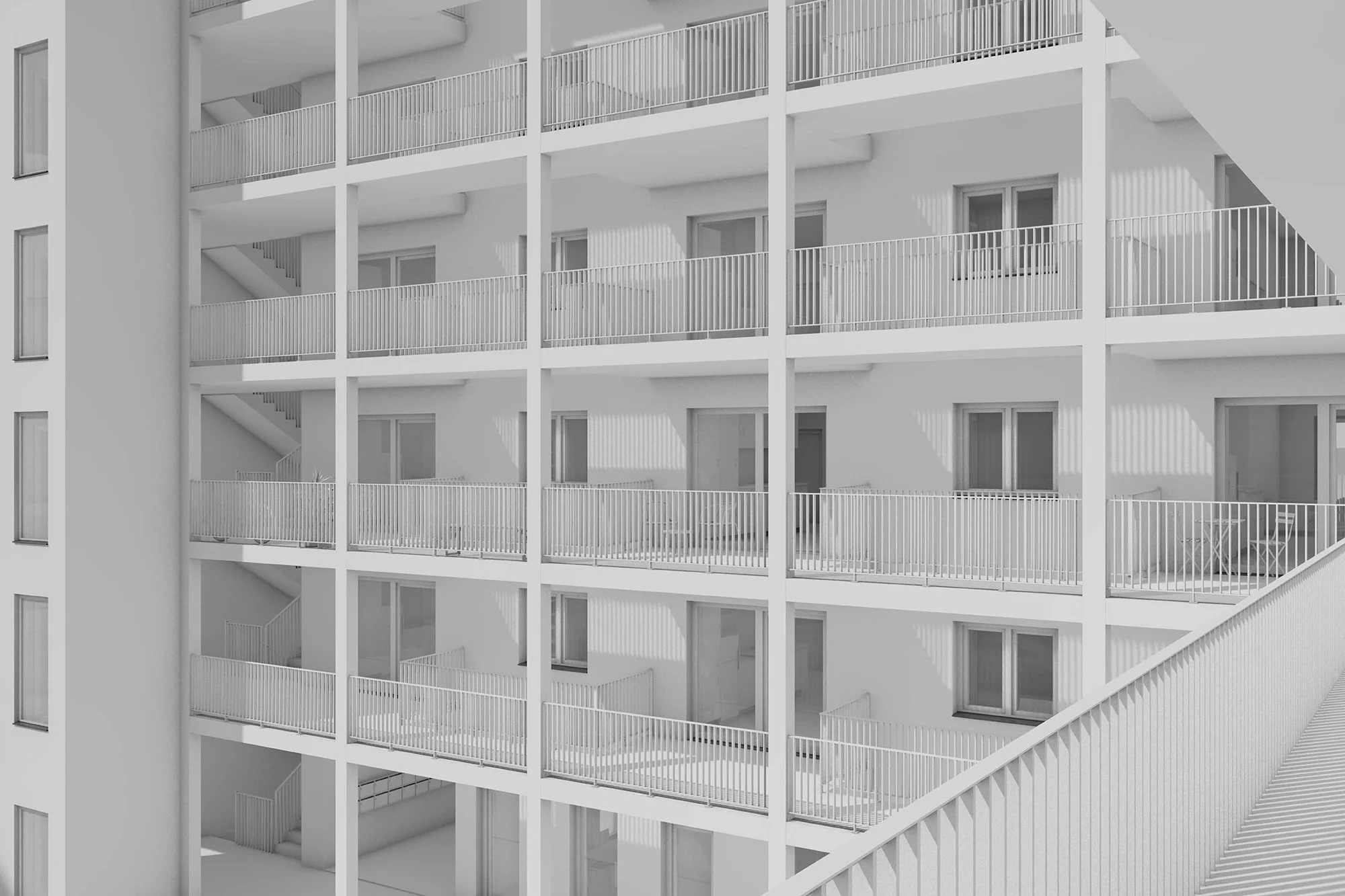 Der Entwurf schafft mit Flexibilität der Wohnungsgrößen und offenem Laubengang eine hohe gemeinschaftliche Wohnqualität.