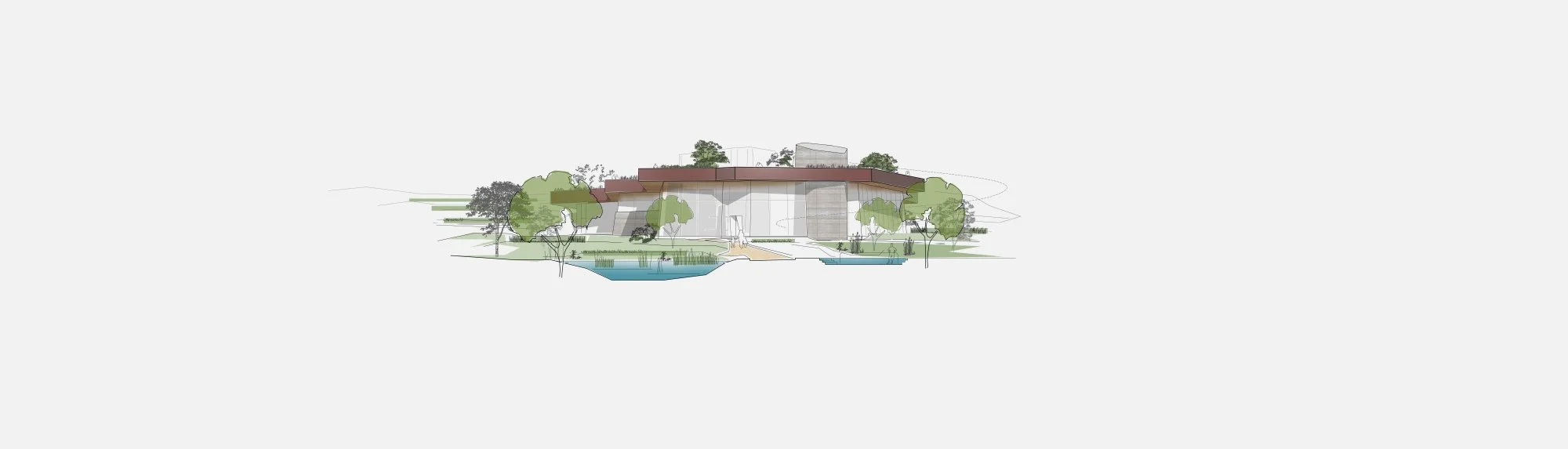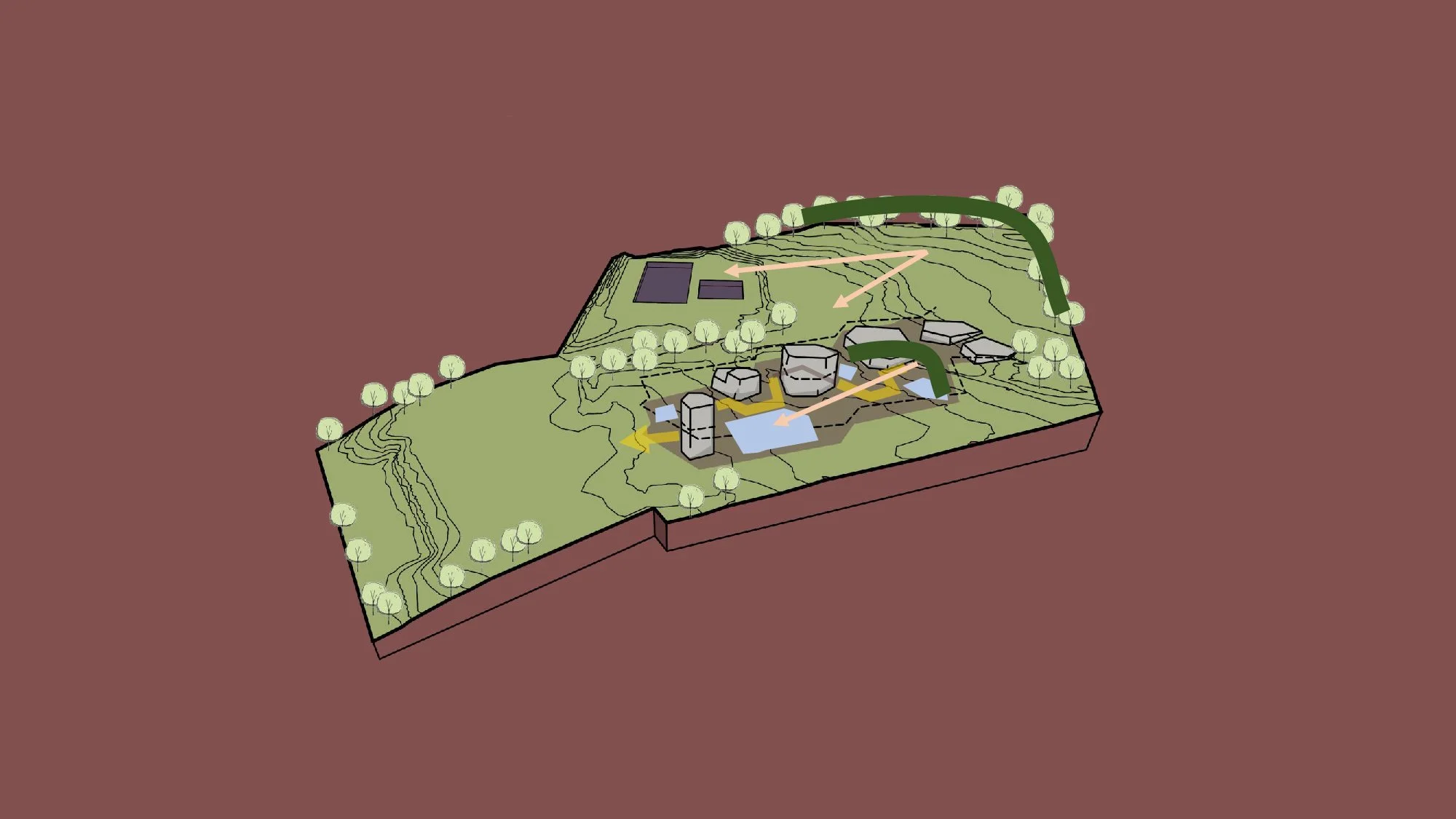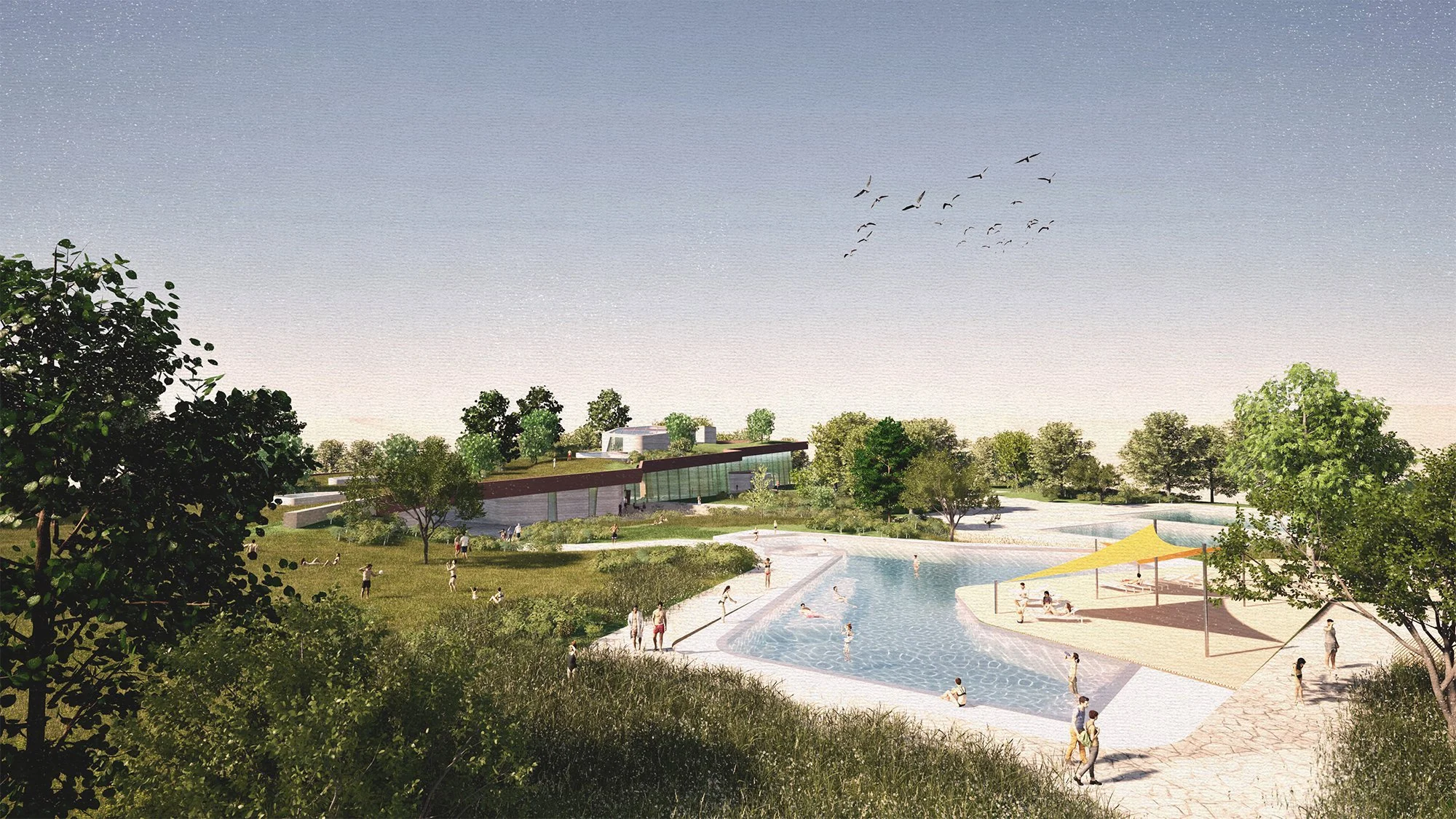 Der Entwurf betrachtet das Grundstück als zusammenhängende Landschaft. Pfade führen den Besucher zu verschiedenen Attraktionen vorbei an Höhen und Senken. Ein Teil des Geländes wird zum Dach des neuen Hallenbads aufgeklappt und bietet den Besuchern einen Blick auf die Stadt. Ein neuer Zugang verbindet das Freibad und Hallenbad. Das begrünte Dach dient der Erweiterung der Liegefläche des Freibades, sowie dem Saunagarten und besteht aus einer Betonkonstruktion mit Hohlkörpern zur Gewichtsreduktion.
