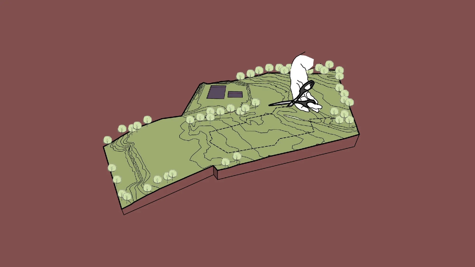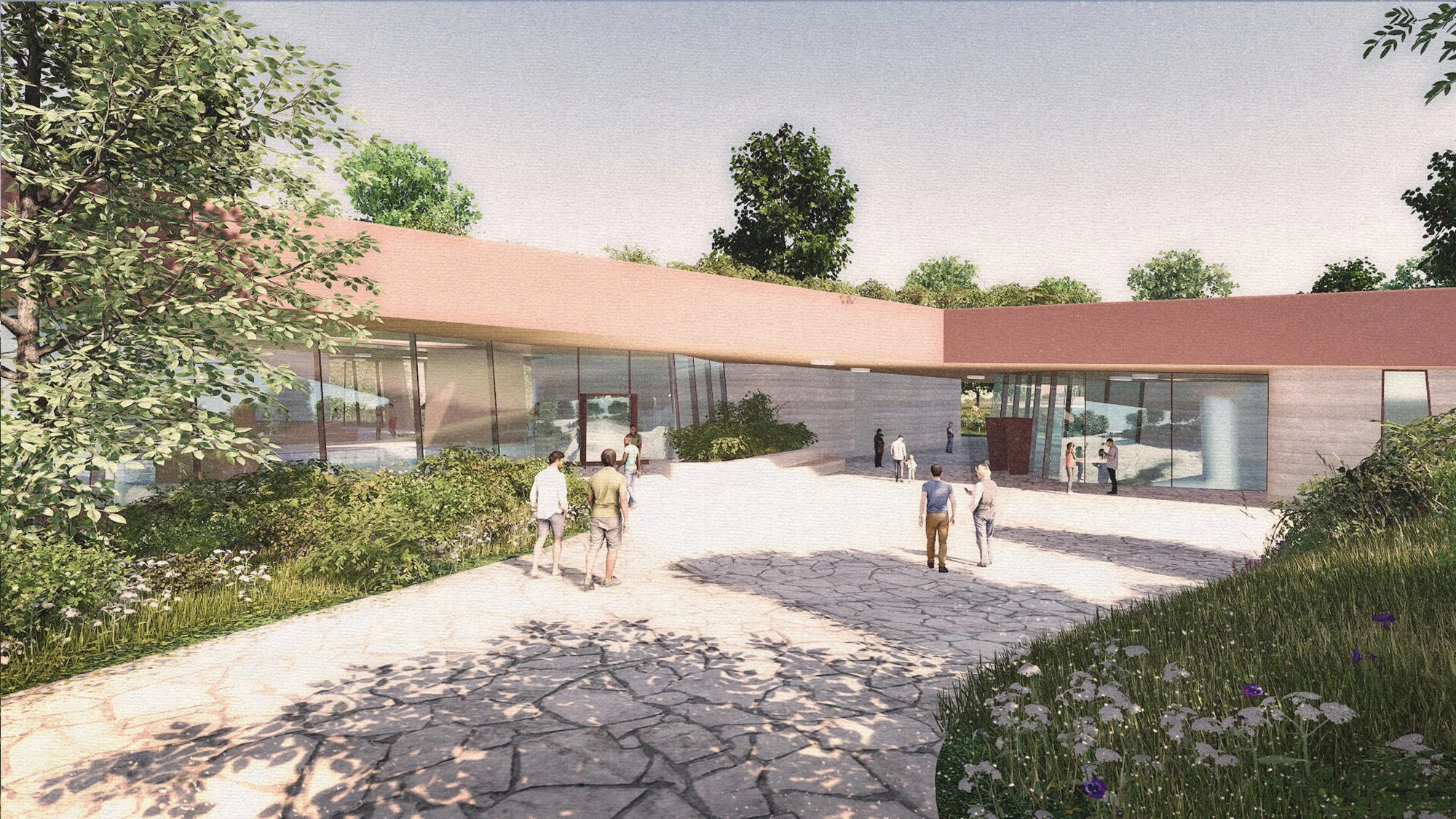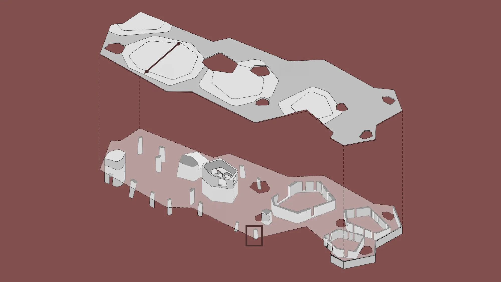 Der Entwurf betrachtet das Grundstück als zusammenhängende Landschaft. Pfade führen den Besucher zu verschiedenen Attraktionen vorbei an Höhen und Senken. Ein Teil des Geländes wird zum Dach des neuen Hallenbads aufgeklappt und bietet den Besuchern einen Blick auf die Stadt. Ein neuer Zugang verbindet das Freibad und Hallenbad. Das begrünte Dach dient der Erweiterung der Liegefläche des Freibades, sowie dem Saunagarten und besteht aus einer Betonkonstruktion mit Hohlkörpern zur Gewichtsreduktion.